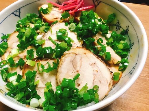 鶏モモ肉をぐるぐる巻くことでかたまり肉のような厚みを表現1枚の鶏肉でどんぶり茶わんが埋め尽くされるほどのボリューム感鶏肉の肉質はしっとりした仕上がり チャーシューはかたまり肉、そう思っていた。 かたまり肉を煮汁でじっくり煮込むのがチャーシュー…