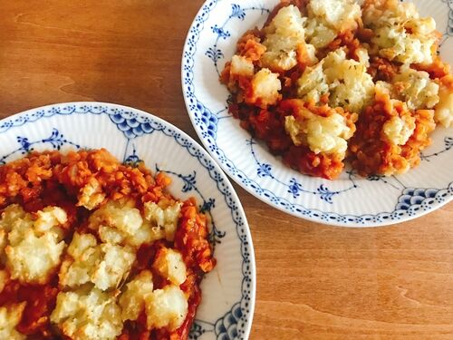 イギリス家庭料理の定番であるシェパーズパイは 「ミートソース」+「マッシュポテト」という2層から成る ほっとするシンプルなオーブン料理である ひき肉の代わりに「レンズ豆」を使って、タンパク質もたっぷりとれる まろやかでコクのあるソースに手作り感…
