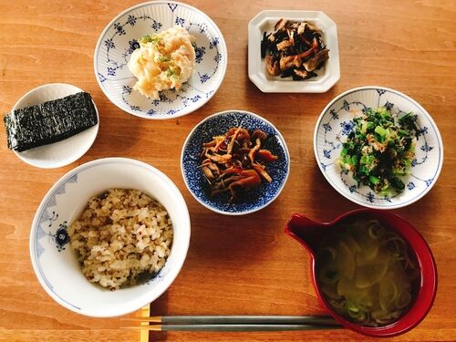 先日、参加したヘルシ オ教室のレッスンで作った「きのこの佃煮(つくだに)」(左)副菜として食卓に並べてみた。献立は、右列上から「ひじきの煮物 」「小松菜のお浸し」「大根とショウガのスープ」中央「きのこの佃煮」左列上から「 ポテトサラダ」「海苔 …