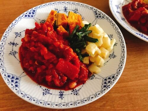 野菜は少し焦げ目がつくくらいヘルシ オでしっかり目に焼く 食感はやわらかく、野菜の甘味、うま味が凝縮された感じ シワシワしたナスとパプリカがとろとろ熱々でおいしい 玉ねぎはくたっ、かぼちゃホクホクである ソースはホットクックで作る 煮立たせず、…