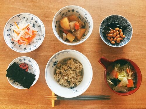 食卓にたくさんの副菜を並べられるように、ホットクックとヘルシ オをフル活用。献立はLINEアプリ「うちレピ」に提案してもらったもの。左上から時計回りに、「さっぱり大根の漬物風 」「肉無し肉じゃが」「黒豆と昆布豆」 「具だくさんみそ汁」「玄米ごはん…
